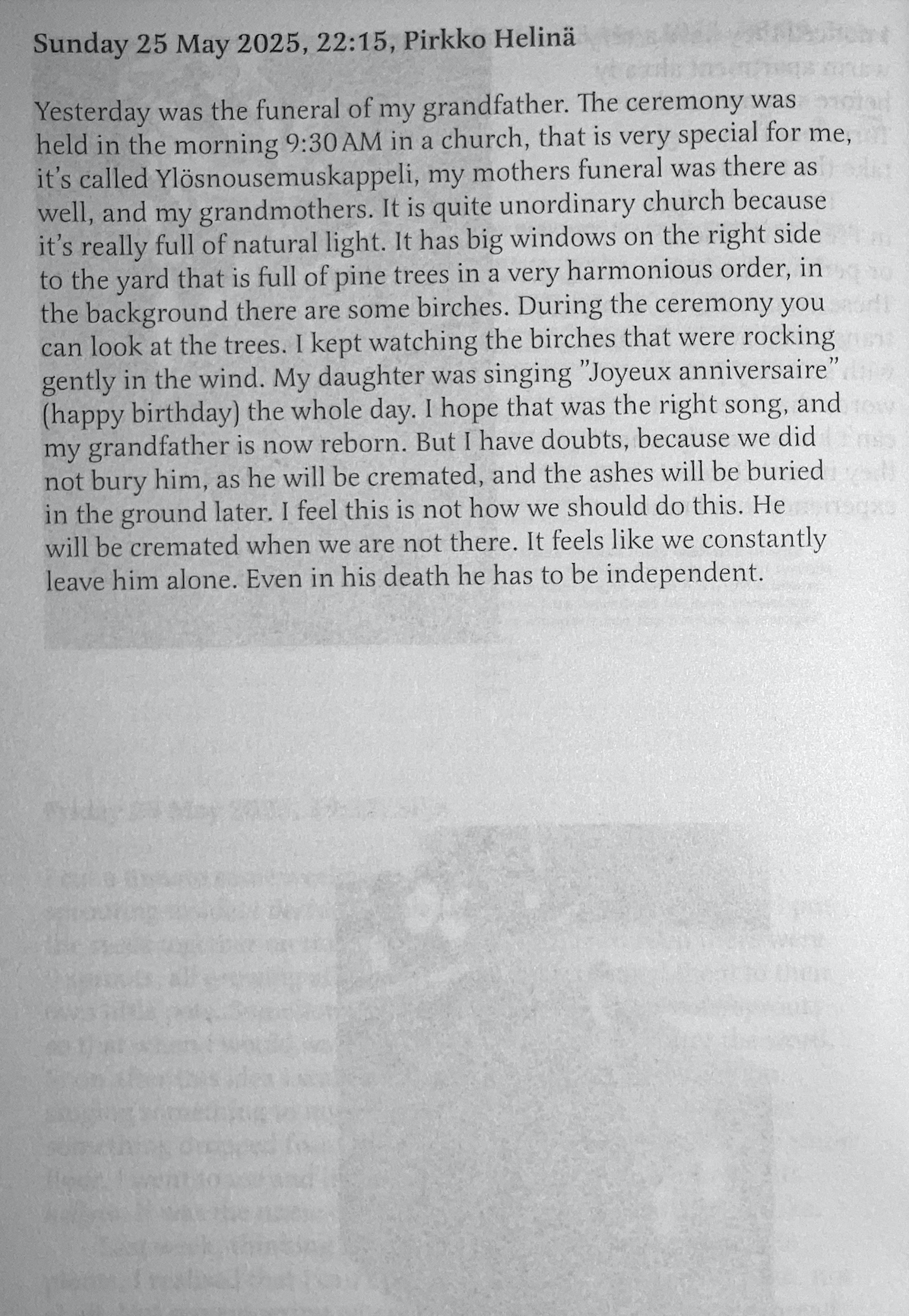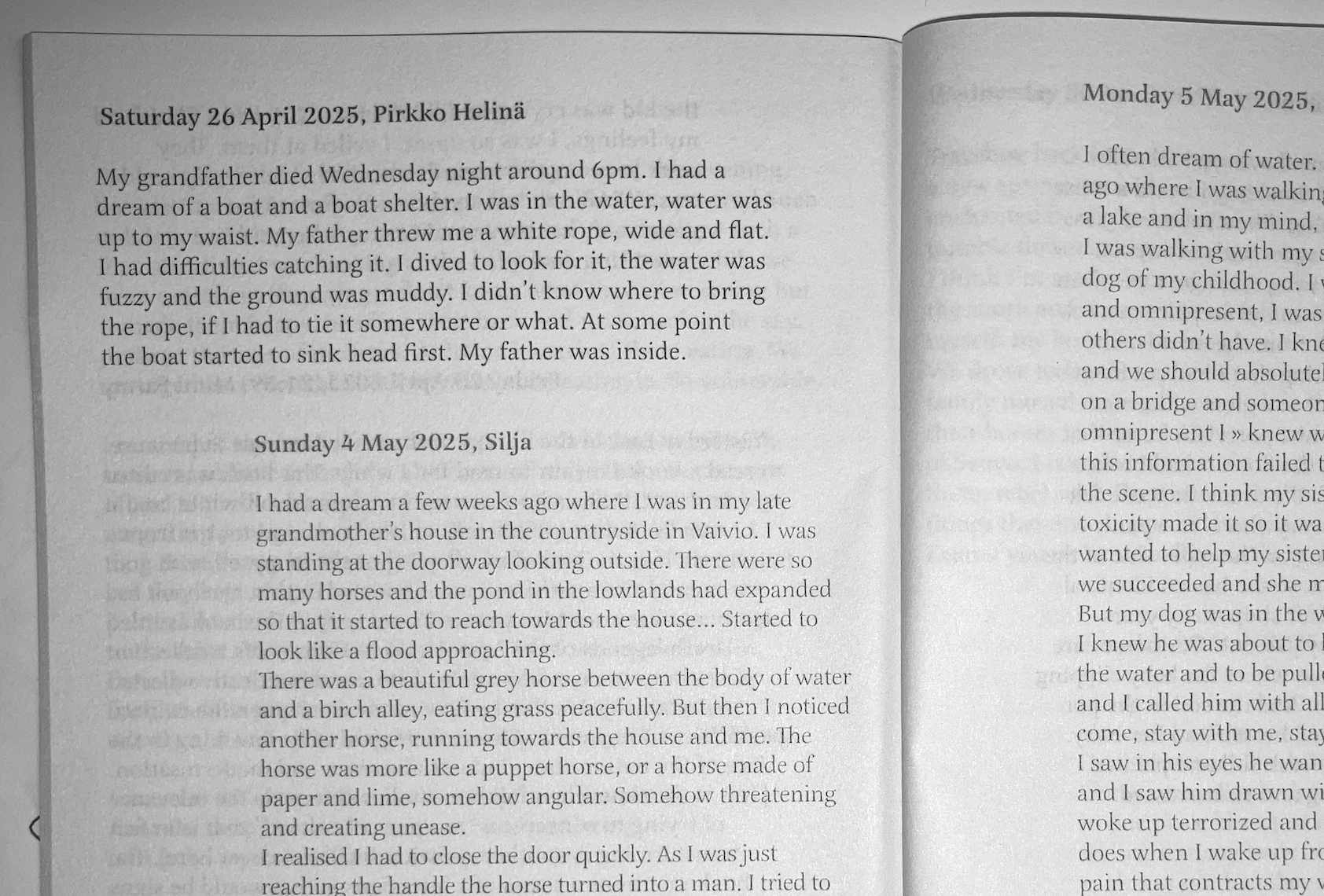 Performance and artist talk was held at Institut finlandais in Paris on Wednesday 25.6.2025. The performance was a continuation of the collective diary-writing practice that the artists shared during two months of spring when nature started to bloom and sprout. In the diary, they shared their inner landscapes through intuitive daily writings about ordinary and extraordinary life, as well as more invisible things.
